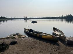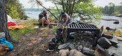 Today I am awake at 445AM to fish. Why did I want to do this again? The plan was to go out to the island and fish there. I don't know if we actually thought we’d be successful, more that it was a fun thing to do. We had most of the gear packed last night so the only thing we had to do was get dressed, eat a light snack, and brew up some coffee. Because we were fairly successful fishing last night, we left a handful of fish on a stringer overnight in the water. Now I'm sure this is not best practice. It probably would have been better to filet them and throw them in my food pack which is still cold. When we went to check on them, we noticed that all the fish were torn to shreds. Some had their heads bitten off, others looked like they were clawed apart by something. We aren’t sure if it was a pike, muskrat, or some other animal? It was shocking to all of us. Nobody heard anything which is a little surprising due to how close our tents were. Nonetheless, we clean up the mess and depart for the island we visited yesterday. We spent about 2 hours fishing there without a single bite. Reflecting on it as we returned, we might have had more success just staying at camp. It was still a fun little expedition.