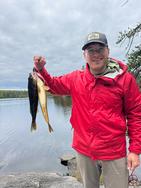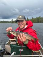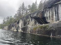 Saturday, September 06, 2025 [paragraph break] Trout on Little Saganaga [paragraph break] ~Makwa Lake, Elton Lake, Little Saganaga Lake [paragraph break] Day four dawned with less rain but with unrelenting west wind and temperatures holidng in the low 40s. We decided to head up to Little Saganaga to see if we could get some lakers. We chose the two small portages at the north end of Elton (over the ~130 rod one midlake) and it proved to be an easy trip. This was my first time on Little Sag and I see why folks love it. It's big, but complex in a way that gives you a sense of security even in the high winds we were facing that day, and seemingly infinite spots to explore. Definitely a lake to hit again on a different trip. We found a couple of trout north of the island that campsite #816 is on, trolling silver and blue 4.5 inch Doctor Spoons in 35-45 feet of water. Then we found them absolutely stacked up in the passage south of that island, where the wind seemed to be pushing baitfish into the deep choke point the smaller island to the south. We hooked a monster and sadly lost it at the boat, but ended the jaunt with a nice eater to bring back to camp. [paragraph break]
