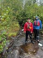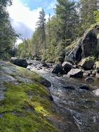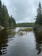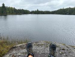 Friday, September 05, 2025 [paragraph break] Humpback PMA - Birl, Churn, Hotfoot and a little beyond [paragraph break] ~Makwa Lake, Birl Lake, Churn Lake, Hotfoot Lake [paragraph break] Though our man's sickness had in fact worsened overnight and a steady, discouraging rain continued to fall, we decided to suck it up and do some bushwhacking. We used the creek southwest of site #985 as the path of least resistance to reach Birl from Makwa. While it was almost certainly the optimal route to get in, the going was still tough. The creek becomes unfloatable rapidly and the growth is thick and low around it. Footing is very rocky as the creek ascends to the higher elevation Birl, and doesn't allow for a straight shot, but rather tracks back and forth across the hillside. Finally it ended in a smallish beaver pond that had to be forded before you got to the main lake. Probably one of the shorter bushwhacks into a PMA, but not a freebie by any means. [paragraph break]