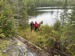 [paragraph break] Birl is a charming little lake, and our depthfinder never showed deeper than 25 feet. We didn't see many likely spots for a campsite as much of the northern and eastern shores are rocky with dense tree cover. Churn and Hotfoot each sit visibly higher than Birl, so that the small chain feels like descending pools down to Makwa. We were initially going to follow the water flow that comes down from Churn, but it was particularly steep and dense there with deep swampy footing. We chose to make the bushwhack at a slightly wider point to the south that allowed for a shorter, though still steep climb, and we could hand the canoe up without too much trouble. [paragraph break]