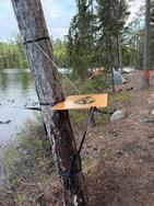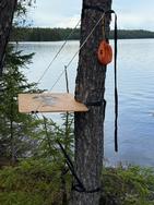 Savage Voyageur: "I would not suggest you use your rope setup. There is too much slack in the cord no matter how tight you get it. Instead fabricate a plywood board that has a cutout for the tree trunk similar to the pictures above. The one’s I’ve made were stabilized with a tree branch to the ground. At the end of the trip you just burn the board in the fire so you don’t have a smelly board in your pack or car. "
