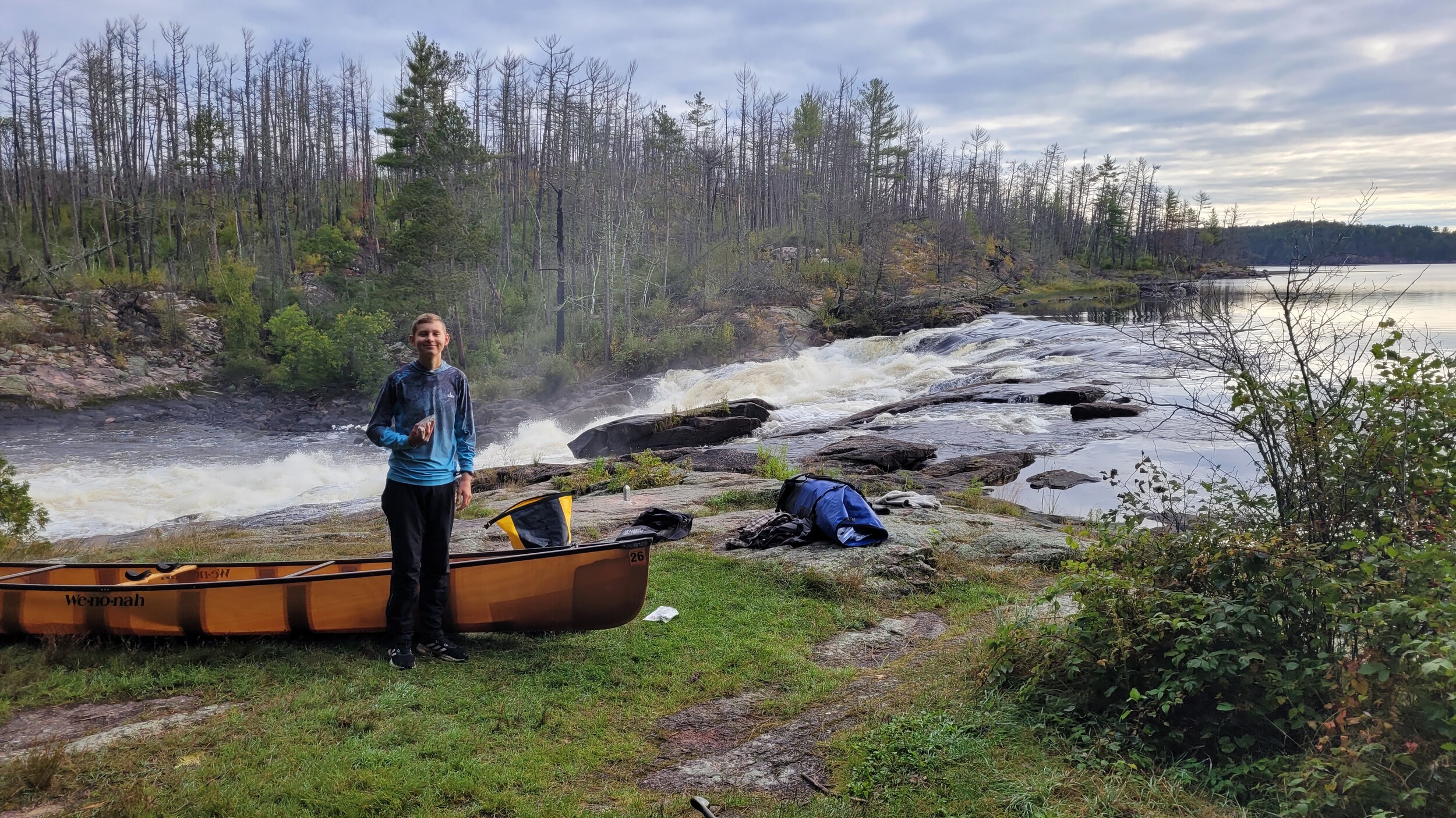 Day 2 We woke up and changed into our wet clothes and paddled to the portage. We got out and did the portage into Bottle Lake with ease. We quickly crossed Bottle and Iron Lake and portaged into Crooked. We took a long break at Curtain falls to eat our wraps and some other snacks.