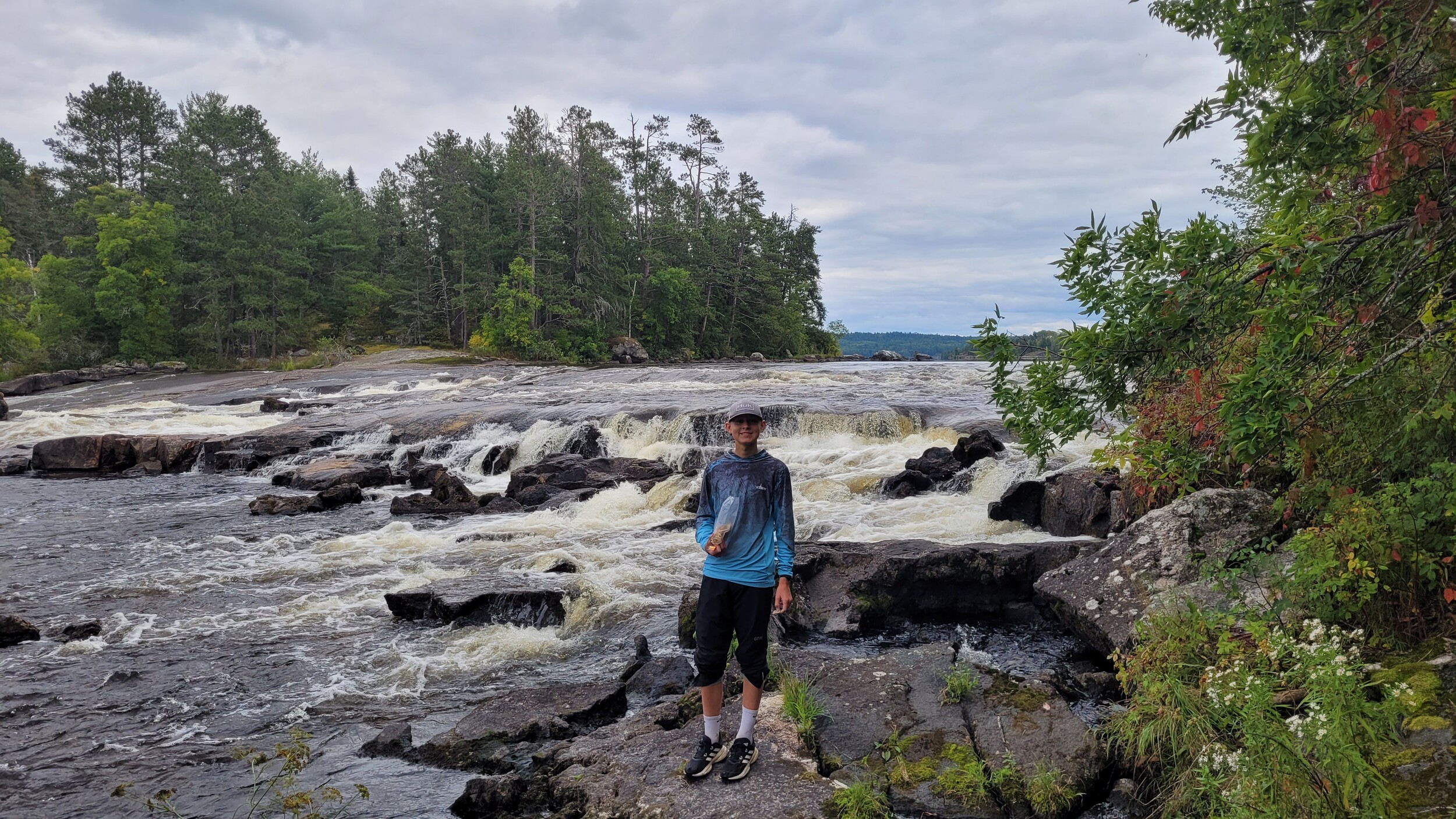 We paddled on Crooked for about two hours and took a bathroom break at Cadillac Narrows. After that we paddled for thirty minutes through Little Current and stopped to try to roll a giant boulder into the lake. We were unsuccessful. We looked at the pictographs at the end of the lake, and then arrived at Lower Basswood Falls. We called my mom, ate food, and threw some rocks in.